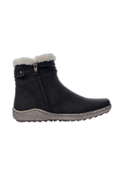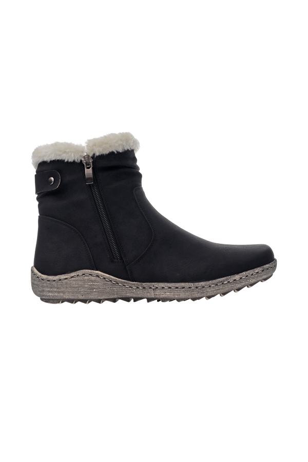 Sturdy ankle boot with faux nu-buck upper and faux fur collar
