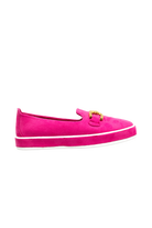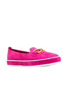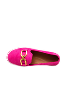 Comfortable stylish and flexible loafer on low platform sole with embellished metal trim.