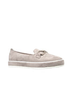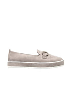 Comfortable stylish and flexible loafer on low platform sole with embellished metal trim.