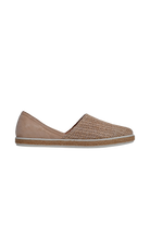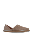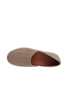 Comfortable and flexible shoe with raffia upper on low profile sole, with rope wrapped trim.