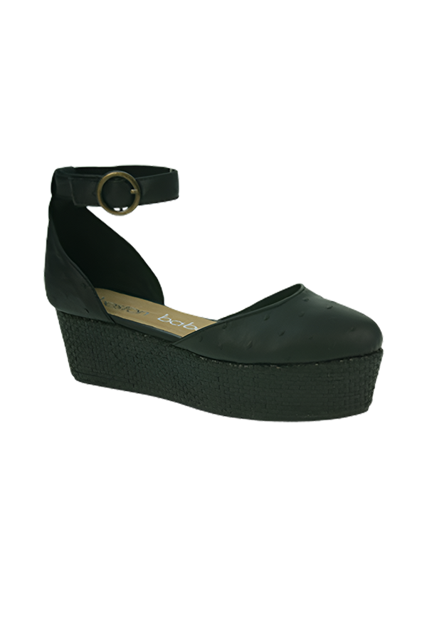 Platform shoe; textured faux leather with ankle strap .