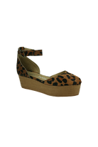 Platform shoe; faux suede leopard printed material with ankle strap .