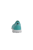 WALKER is a traditional slip-on sneaker.  Combining a light weight white sole and a padded sole in a stretch material and a bright fun aqua shade.